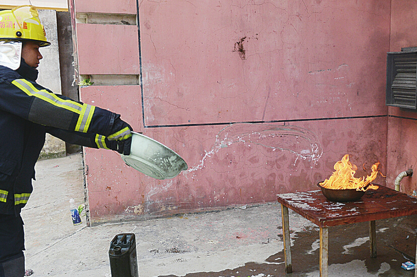 一名消防戰(zhàn)士模擬端起小盆自來水往油盆里潑滅火。油遇水的一瞬間,突然猛烈爆燃,火花四濺,布滿整個桌面,并且持續(xù)燃燒,火災(zāi)無法撲滅。