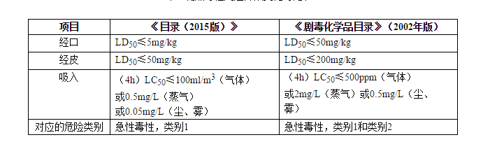 判定界限與《劇毒化學(xué)品目錄》(2002年版)對比發(fā)生了較大變化(見表2)。